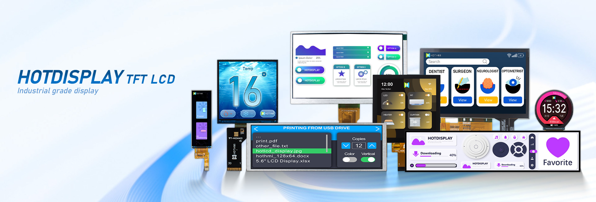 HOTLCD創(chuàng)立22年來(lái),已開(kāi)發(fā)出超過(guò)2000標(biāo)準(zhǔn)和非標(biāo)準(zhǔn)液晶顯示屏及模組,廣泛應(yīng)用于人工智能、5G通訊、無(wú)人機(jī)、物聯(lián)網(wǎng)、車聯(lián)網(wǎng)、智能家居、智能穿戴、智慧交通、儀器儀表、醫(yī)療設(shè)備、工控設(shè)備、電力設(shè)備、勘探設(shè)備、航空航天、軍事裝備等諸多先進(jìn)領(lǐng)域。